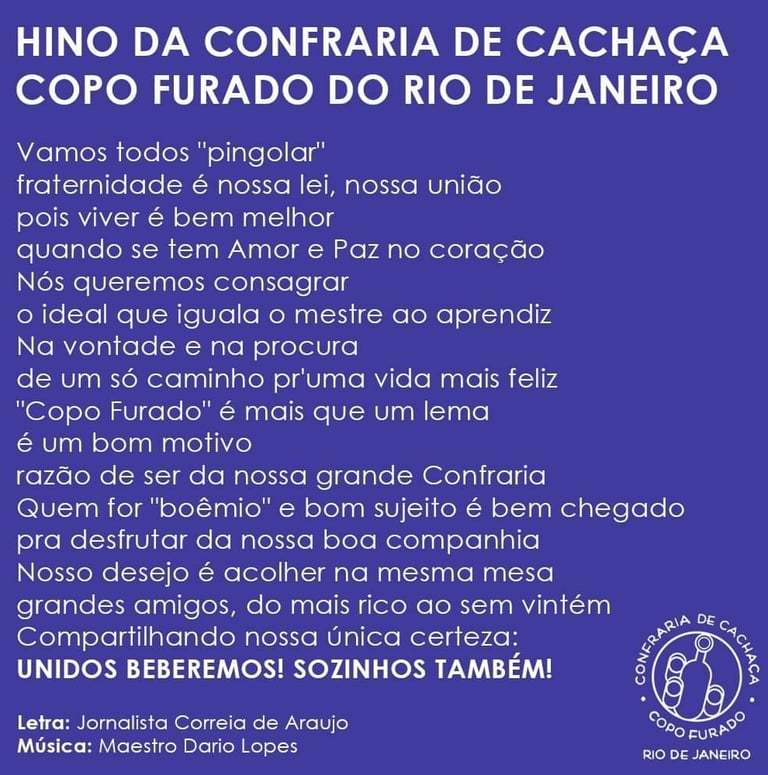É uma vibrante e carioquíssima história que começou totalmente sem compromisso, lá pelo idos de 1994, em Ipanema, como não podia deixar de ser, em volta de uma mesa de bar, entre amigos boêmios, que gostavam de curtir uma cachacinha e papear. Esses encontros eram tão bons que os amigos foram chegando e descobrindo o valor do bom papo, dos belisquetes e daquelas branquinhas de alambique, de irresistível sabor e de alta qualidade. A partir daquele momento, resolveram dar nome aos encontros e surgiu a Confraria Copo Furado.